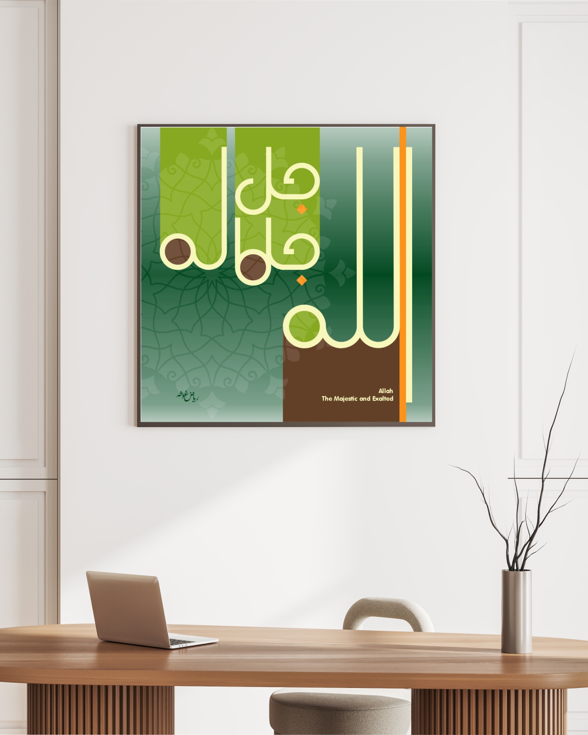 This stunning digital art piece by Riyad Ghosheh, available at rbarts.us, beautifully merges Arabic modern calligraphy with Islamic art, capturing the essence of faith, divine support, and spiritual strength. The artwork features a powerful Quranic verse from Surah Mohammad: