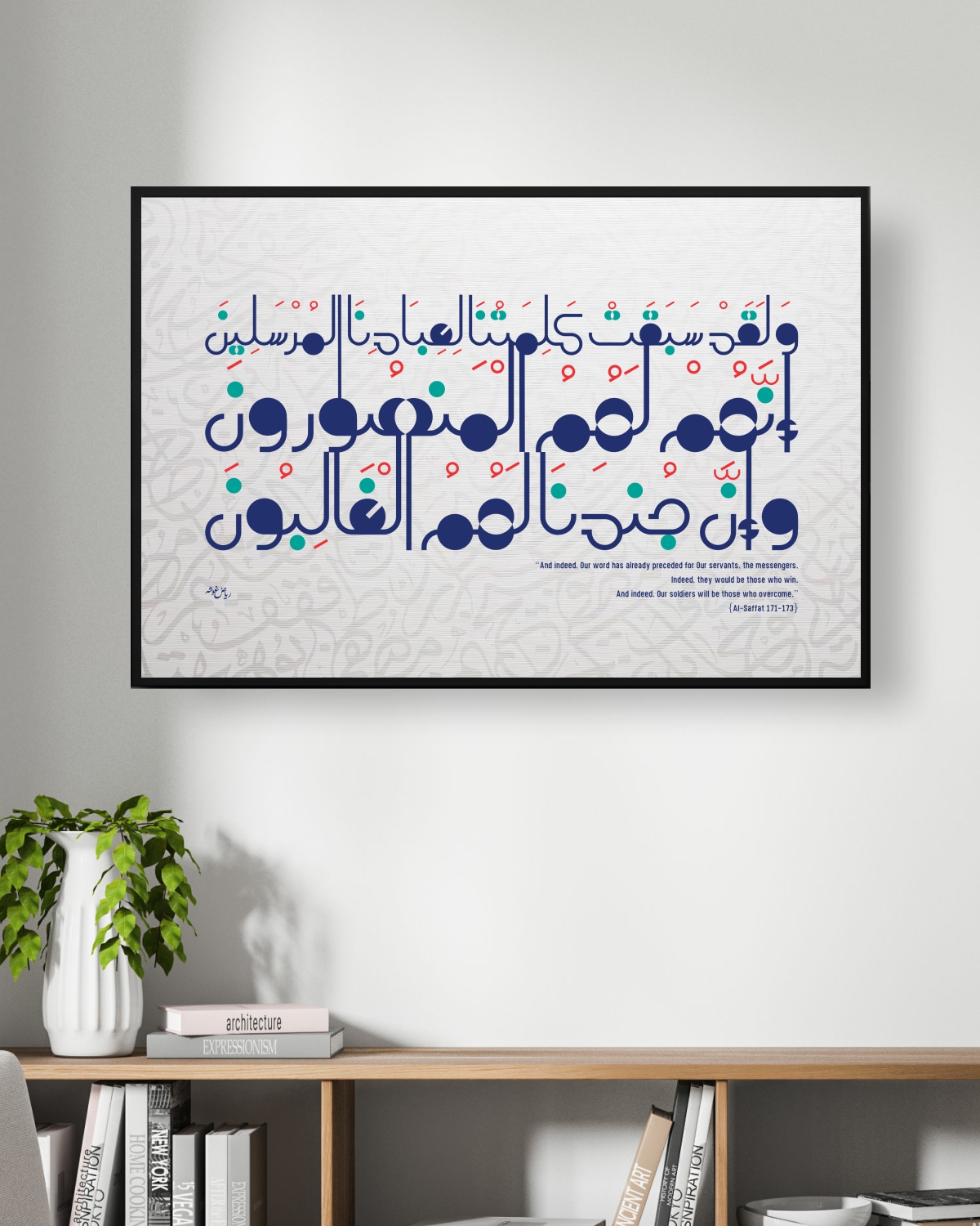 This stunning digital art piece by Riyad Ghosheh beautifully blends Arabic modern calligraphy with Islamic art, capturing the powerful message of Surah Al-Talaq, Verse 7: