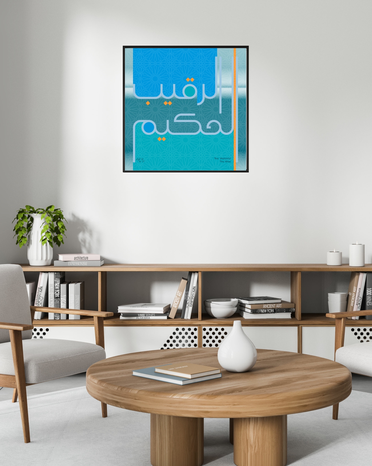 Discover a stunning digital art piece by Riyad Ghosheh, now available at rbarts.us. This captivating work beautifully blends Arabic modern calligraphy with Islamic art, featuring the names of Allah: Ar-Raqeeb (The Watchful) and Al-Hakeem (The Wise).