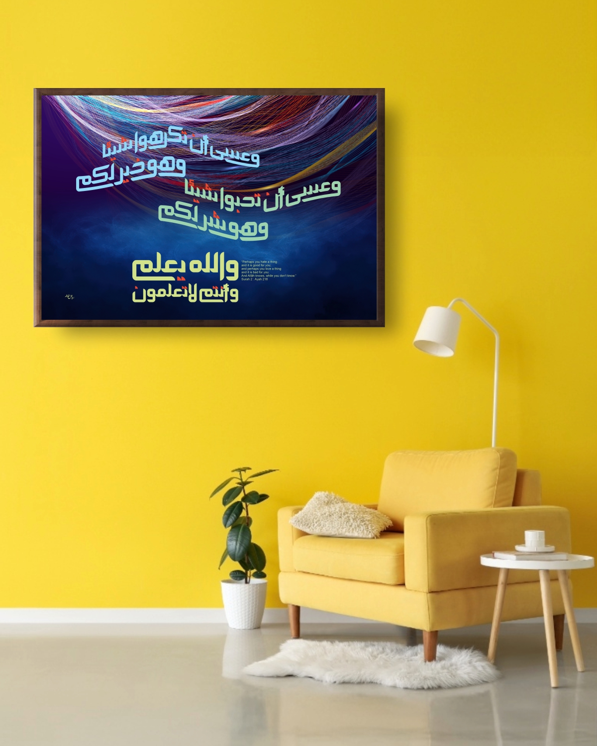This stunning digital art piece, created by the talented Riyad Ghosheh, features a unique fusion of Arabic modern calligraphy and Islamic art. The piece beautifully showcases the name "Mohammed" in Arabic, rendered in a contemporary and vibrant style. The use of bold, dynamic colors creates a captivating visual experience, perfect for attracting the attention of younger generations.