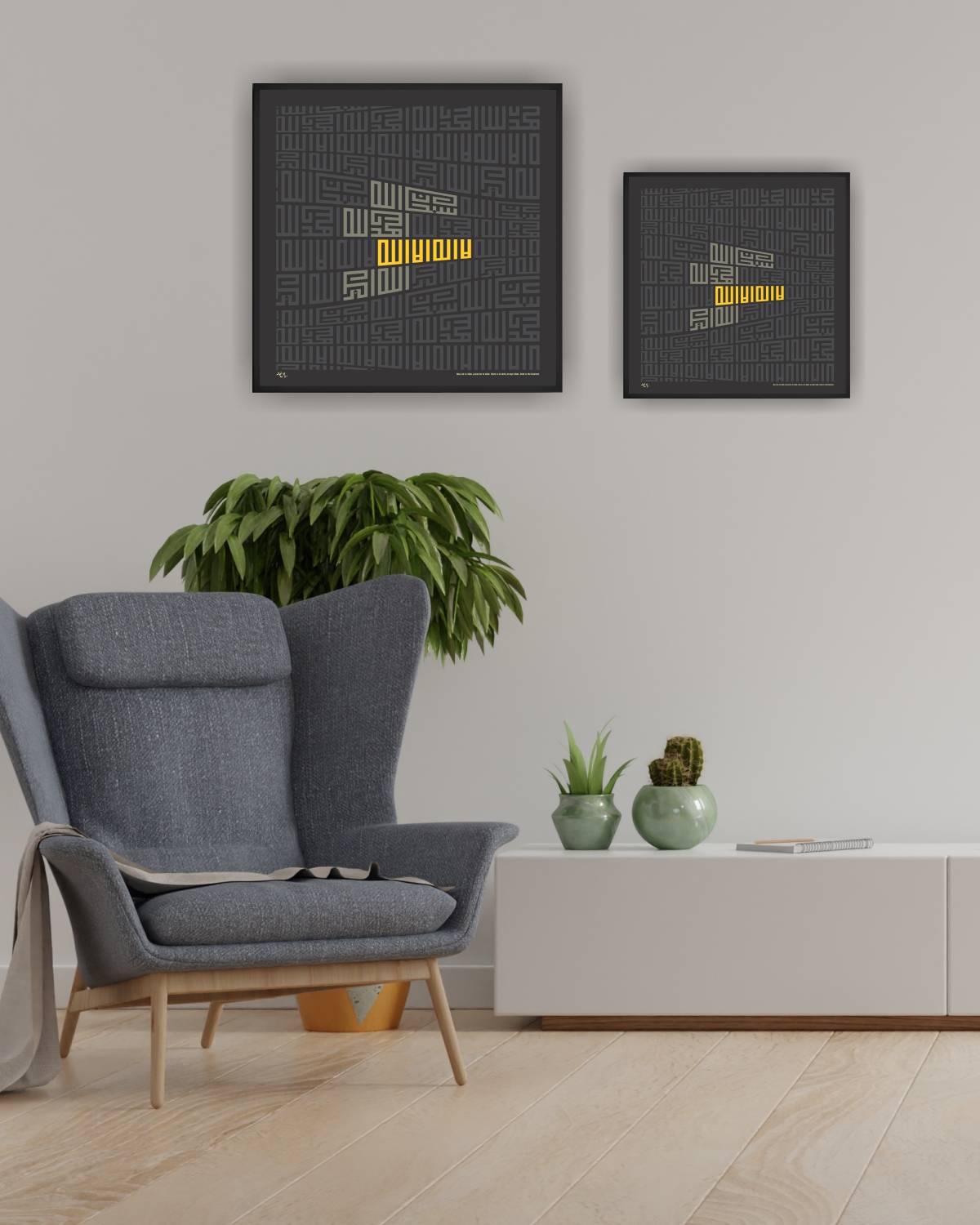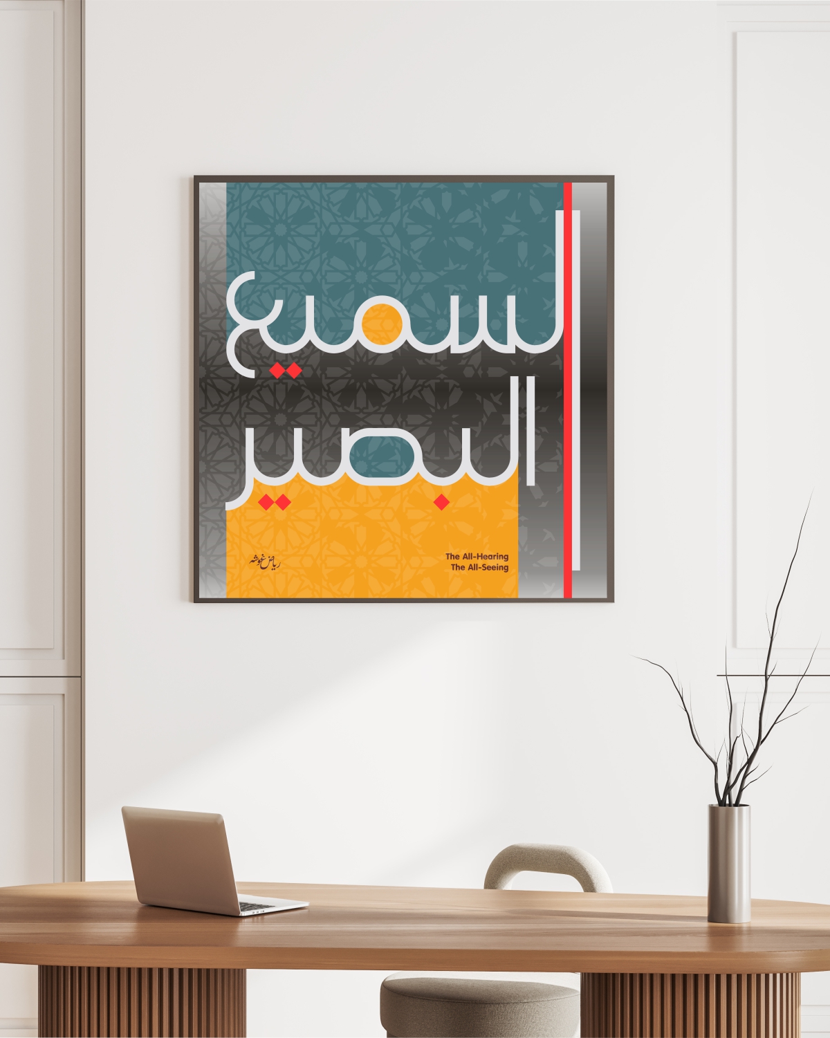 This digital art piece, created by Riyad Ghosheh and available at rbarts.us, masterfully combines Arabic modern calligraphy with traditional Islamic art, centered around the practice of Tasbih (remembrance of Allah). The artwork features the praises "Subhan Allah" (Glory be to Allah), "Alhamdulillah" (Praise be to Allah), "La Ilaha Illa Allah" (There is no deity but Allah), and "Allahu Akbar" (Allah is the Greatest), arranged in an intricate grid pattern that embodies spiritual connection and meditative repetition.