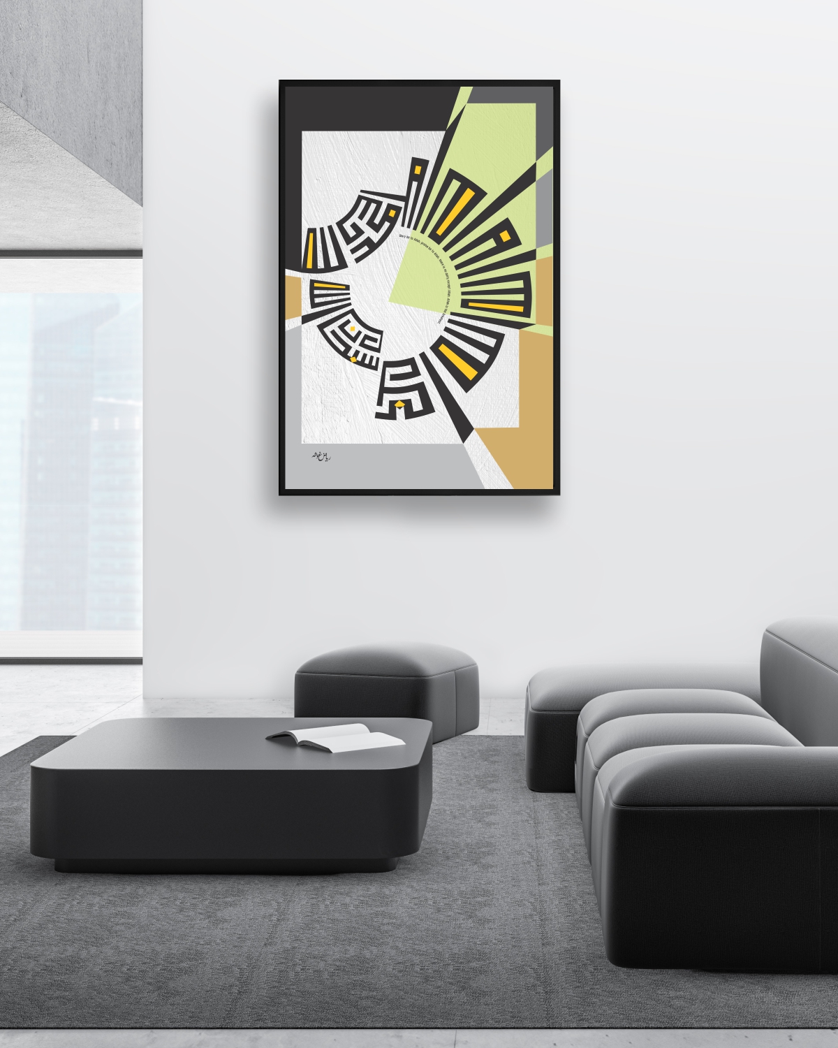 Discover a breathtaking digital art piece by Riyad Ghosheh, available at rbarts.us, featuring a harmonious fusion of Arabic modern calligraphy and Islamic art. This artwork showcases two of Allah’s profound names—Al Awwal (The First) and Al Akhir (The Last)—symbolizing His eternal presence and control overtime and space. Designed to evoke feelings of respect,calm, and rest, this piece serves as a visual reminder that everything is connected to God, instilling a sense ofstabilityandtrustin His ever-present nature.With vibrant colors....