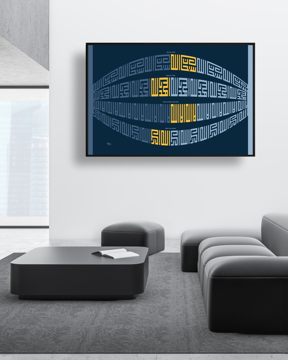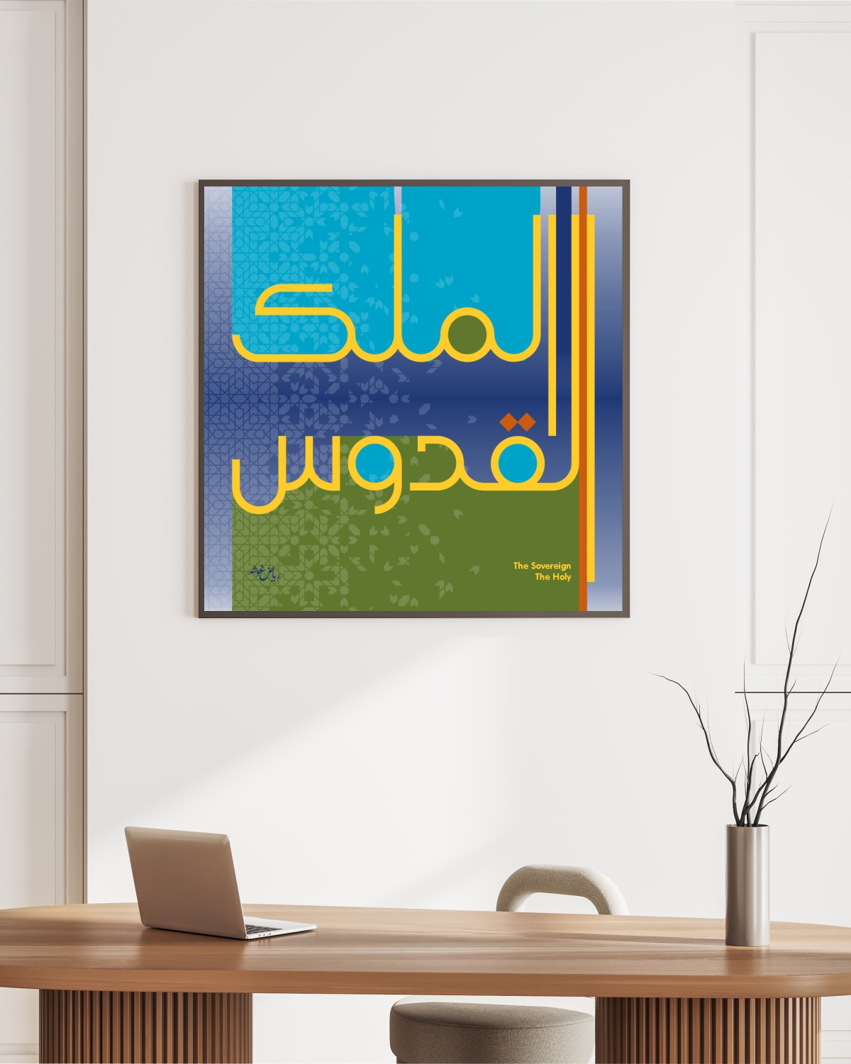 Discover a stunning digital art piece by Riyad Ghosheh, available exclusively at rbarts.us. This masterpiece blends Arabic modern calligraphy with Islamic art, focusing on two of the most revered names of Allah:Al Malik (The Sovereign) and Al Quddus (The Holy). The intricate design not only servesas a visual tribute to these powerful names but also aims to inspire feelings of peace, purity, and justicein the viewer. Crafted with vibrant colors and a contemporary aesthetic, this artwork seamlessly attracts the eyes ofthe young generation,....