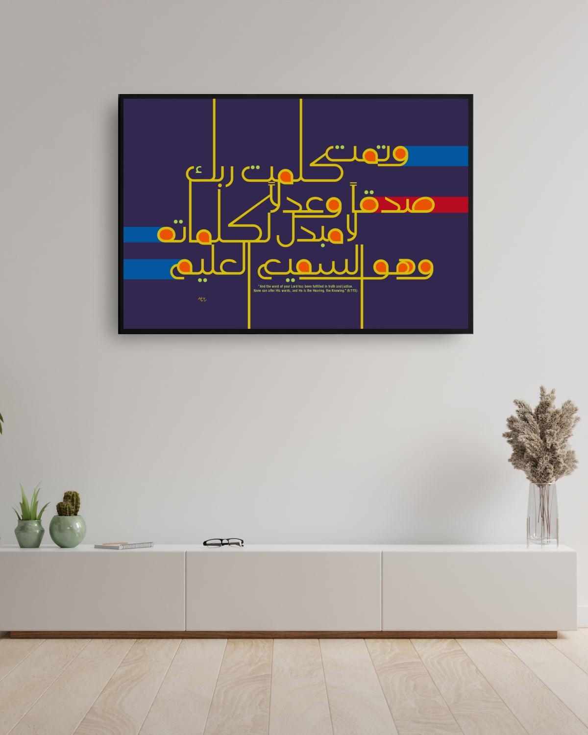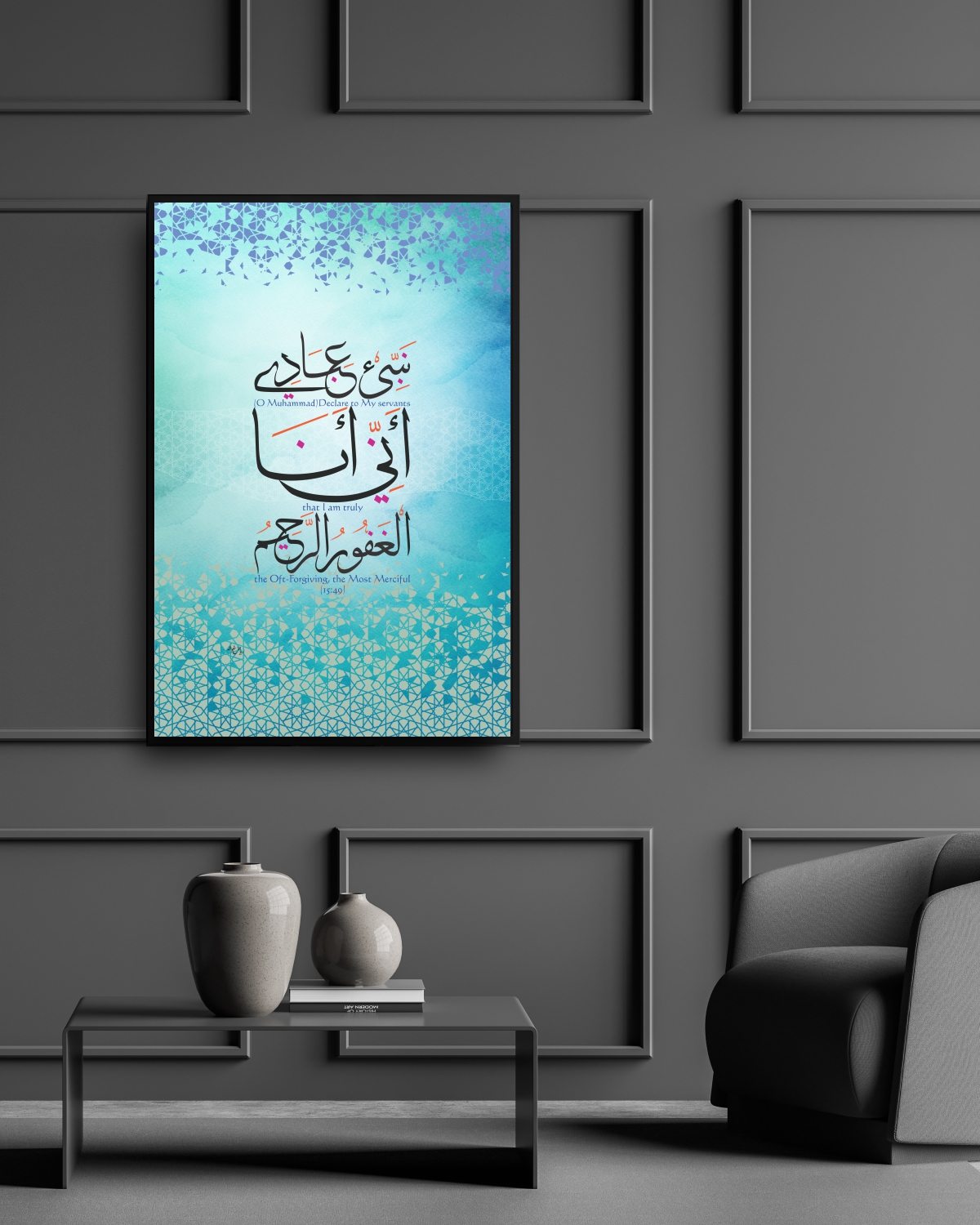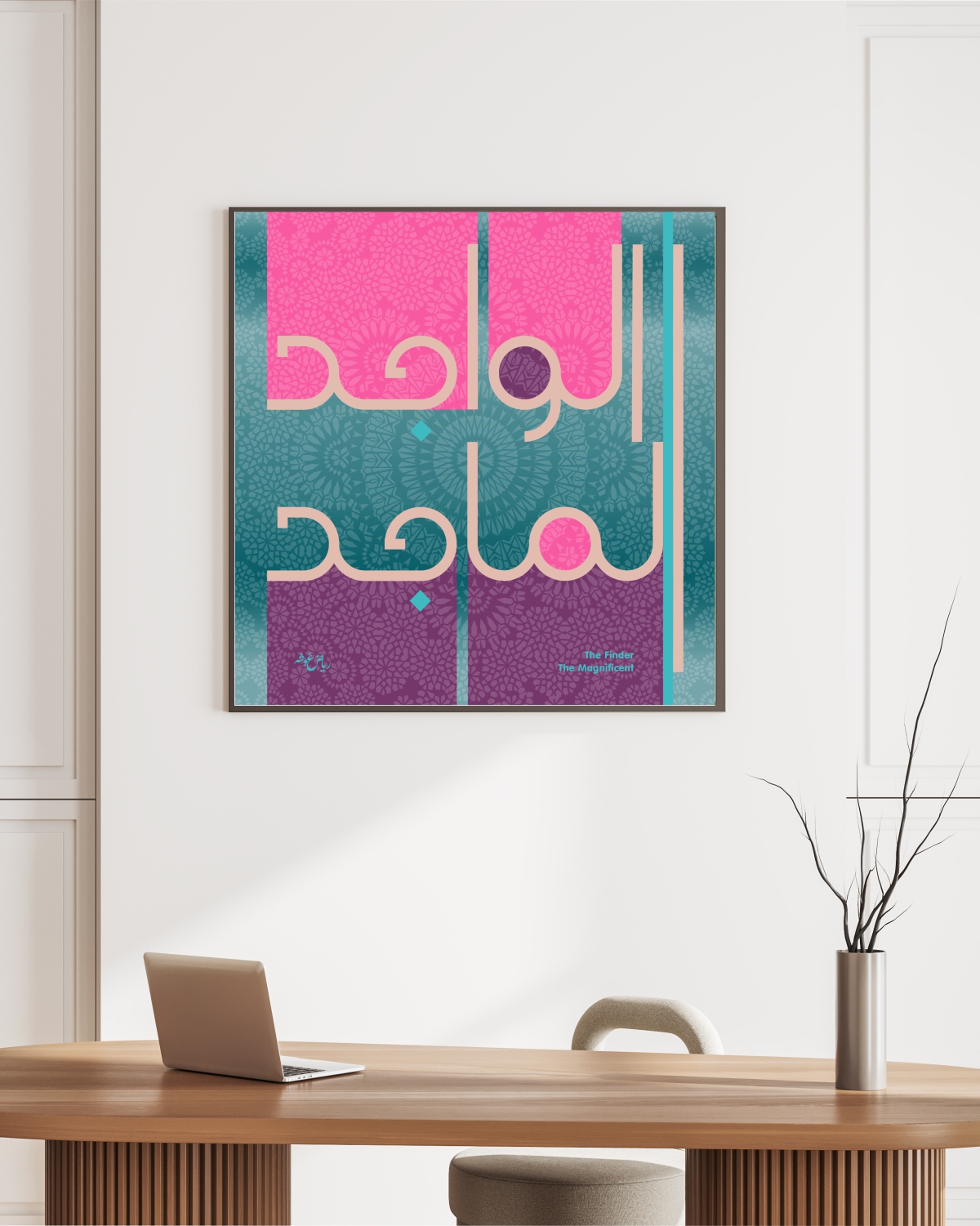 This digital art piece by Riyad Ghosheh, available at rbarts.us, beautifully blends modern Arabic calligraphy with traditional Islamic art. It highlights two revered names of Allah: Al Waajid (The Finder) and Al Maajid (The Magnificent). Through its intricate design, the artwork invites viewers to reflect on Allah's boundless knowledge and presence, inspiring feelings of reverence, honor, and respect in prayer.