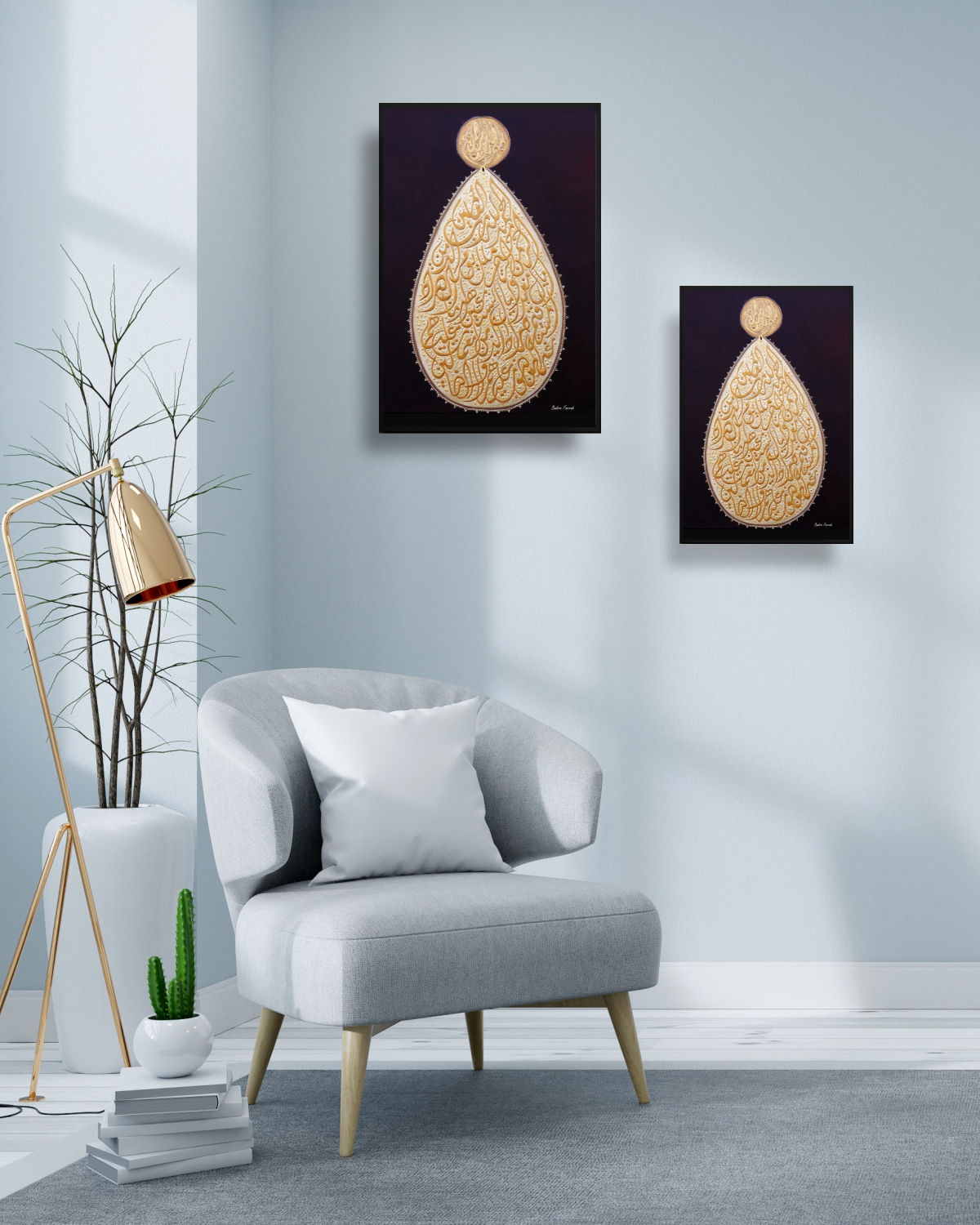 This exquisite artwork by Badra Farrah, available at rbarts.us, showcases a luxurious golden pendant in the shape of a large teardrop, intricately engraved with the text of Surah Al-Fatiha (Bismillahir-Rahmanir-Raheem