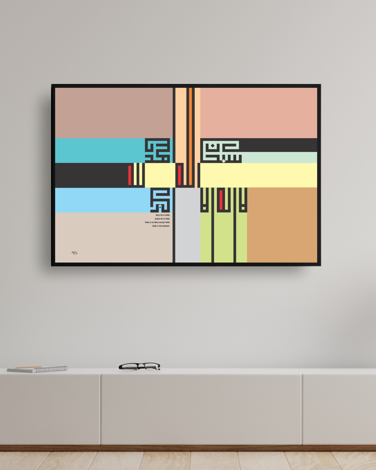 This stunning digital art piece by Riyad Ghosheh, available at rbarts.us, masterfully combines Arabic modern calligraphy with Islamic art. The artwork features symmetrical square Kufic calligraphy, showcasing the Beautiful Names of Allah in bold black script. The script stands out against a vibrant, colorful geometric background, creating a striking contrast that adds a sense of movement and depth to the composition. This piece beautifully blends the rich heritage of Islamic art with a contemporary design, making it an eye-catching and t....