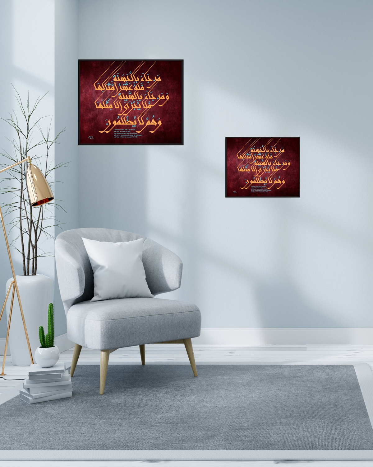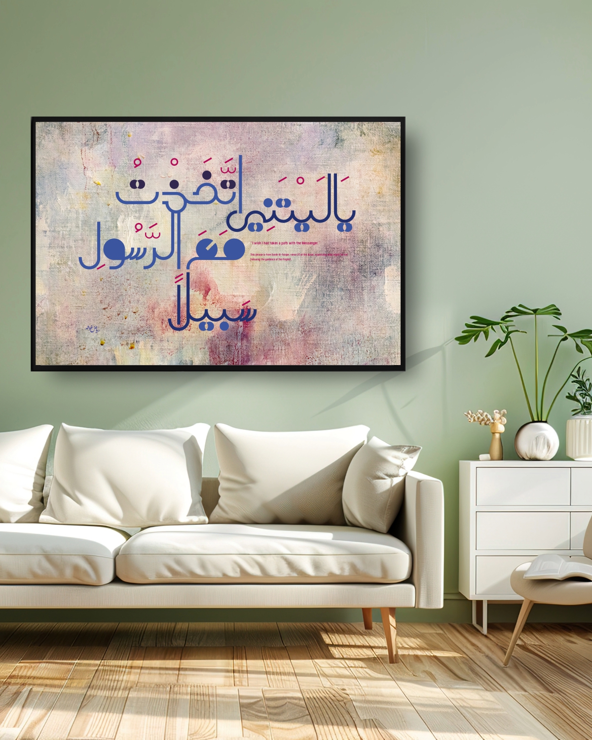 This stunning digital art piece by Riyad Ghosheh, available at rbarts.us, beautifully merges Arabic modern calligraphy with Islamic art, offering a powerful visual representation of trust in God and divine guidance. The artwork is inspired by the Quranic verses from Surah At-Talaq (65:2-3):