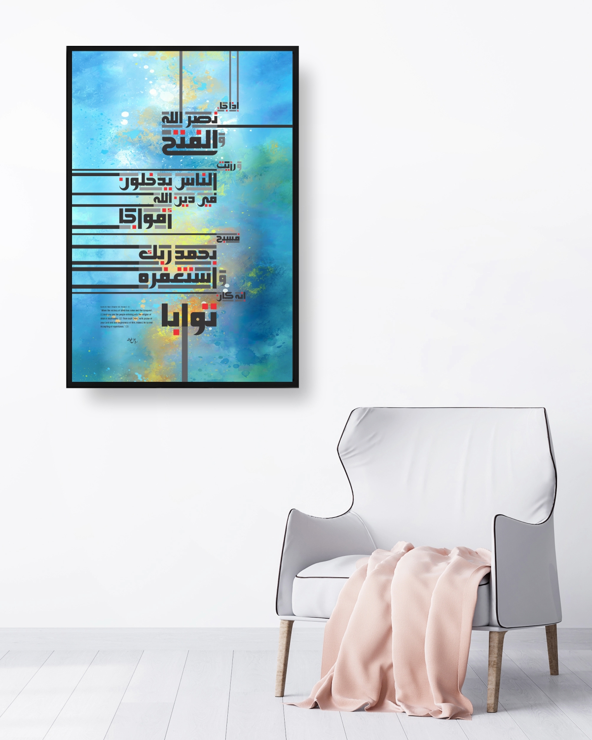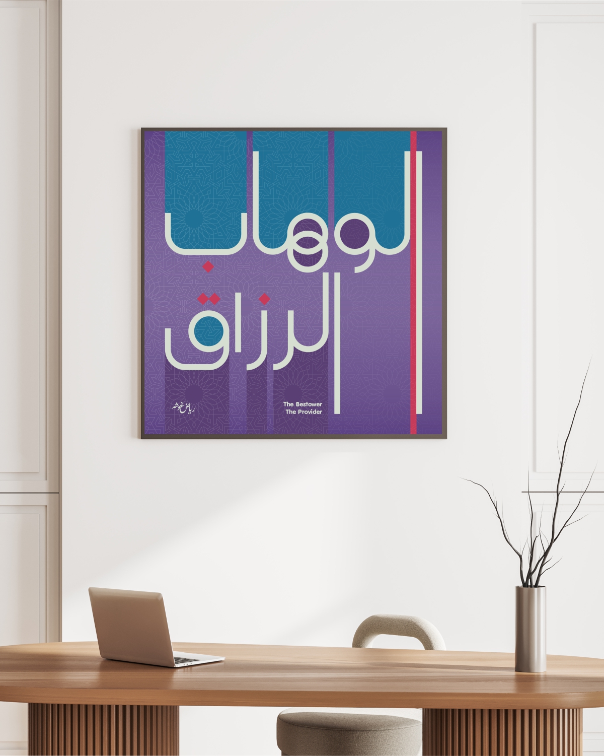 Explore the inspiring digital art piece by Riyad Ghosheh, available at rbarts.us. This captivating work beautifully combines modern Arabic calligraphy with elements of Islamic art, focusing on the names of Allah—Al-Saboor (The Patient) and Al-Shaheed (The Witness). This piece invites viewers to experience feelings of optimism, peace, strength, and safety, reminding us that Allah witnesses our actions and empowers us to endure and remain steadfast in the face of challenges.